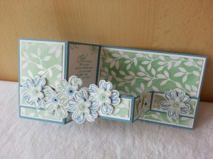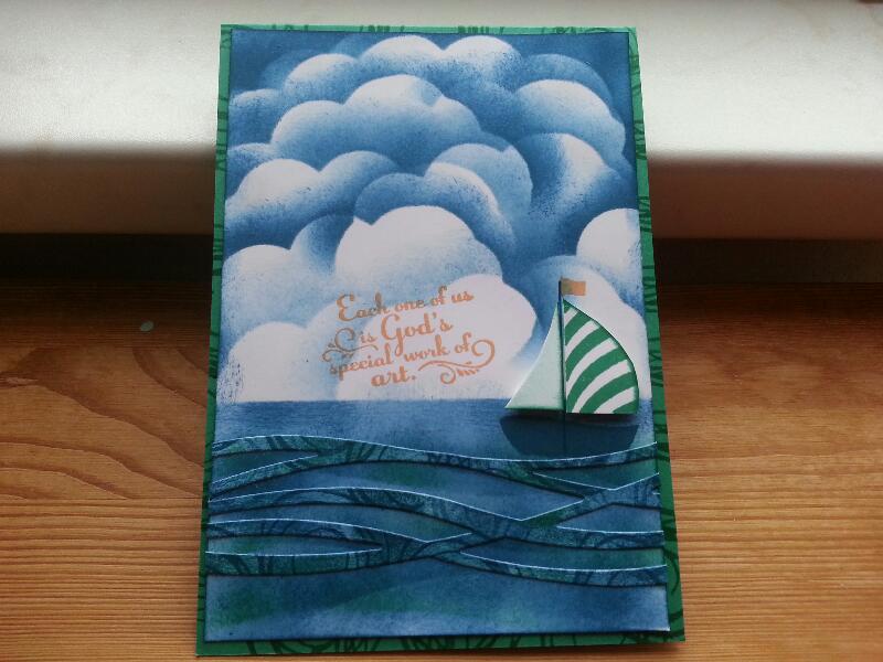 d ik op en heb hem met andere kleuren nagemaakt. De basis kaart is Emerald Envy en op Whisper Wite heb ik gestempeld. Met een wolken mal van Silhouette design de wolken gesponsd met de Dapper Denim inkt. Voor de zee heb ik een combinatie van Dapper Denim en Emerald Envy inkt van SU gebruikt. Met de snijmal van de Swirly Bird de “golven” uitgestanst en met Dapper Denim en Emerald Envy gesponst, daarna opgeplakt op de basis kaart. Het bootje is eveneens met Dapper Denim en Emerald Envy gestempeld en uitgeknipt evenals het zeil en opgeplakt. daarna de basis kaart met Emerald Envy en een “cirkelstempel” van de Swirly Bird gestempeld en daarna de gestempelde kaart erop geplakt. De tekst die op de kaart staat komt van de stempelset Trust God. De wolken zijn met een zelgemaakte mal gekleurd